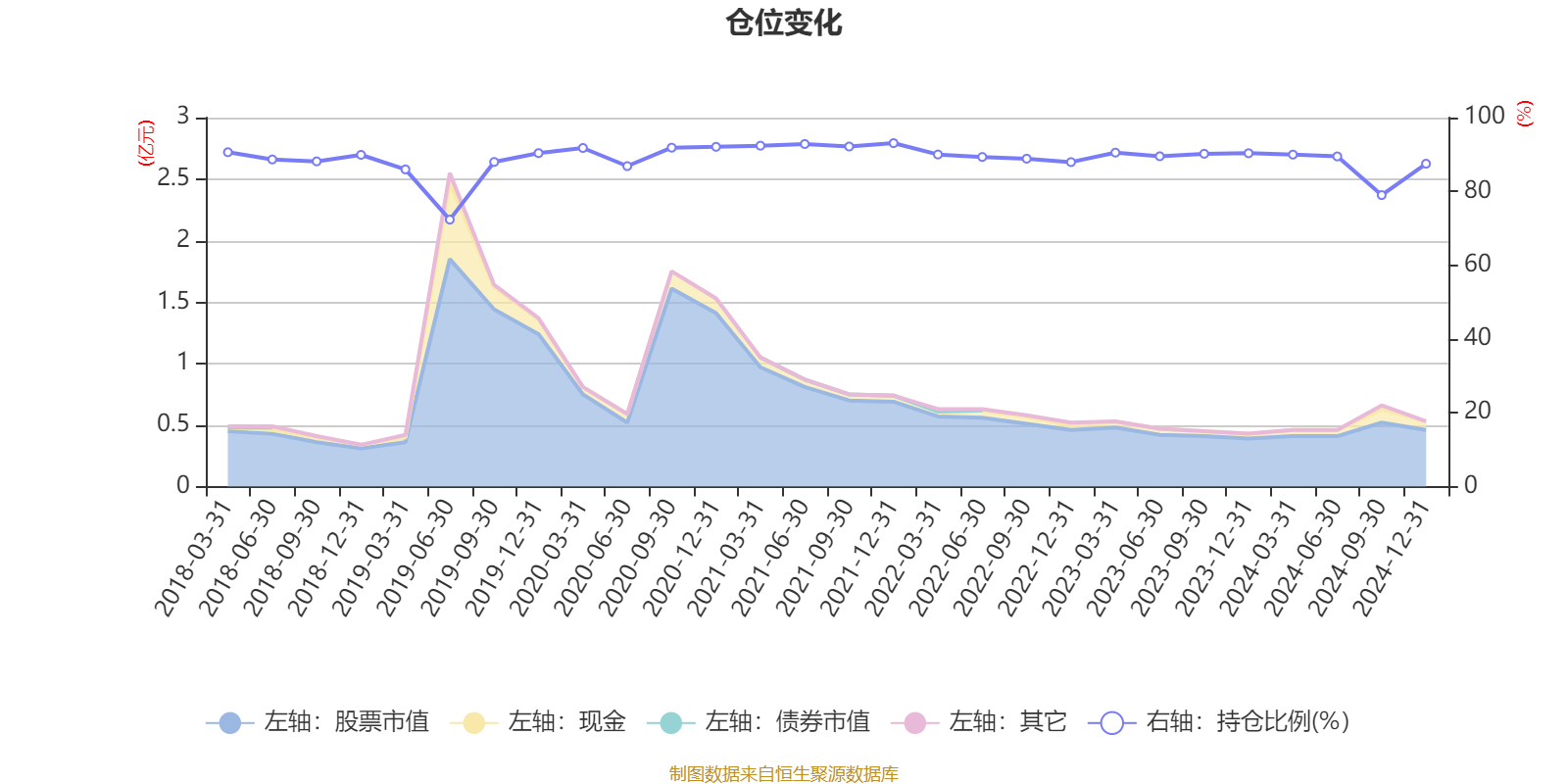 据定期报告数据统计,近三年平均股票仓位为88.55%,同类平均为88.09%。2021年末基金达到93.08%的最高仓位,2019年上半年末最低,为72.35%。