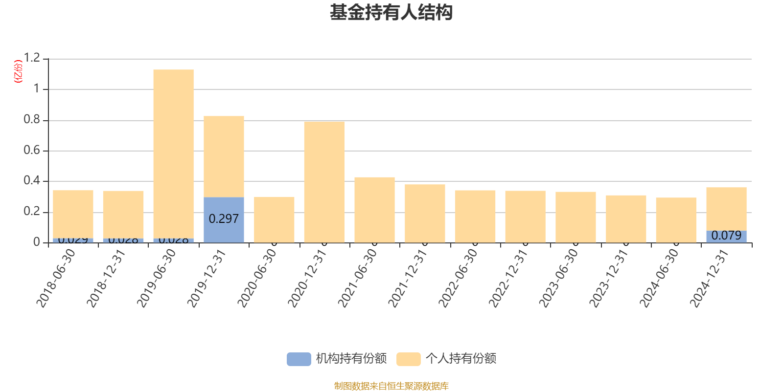 截至2024年12月31日,基金持有人共计3185户,合计持有3608.79万份。其中管理人员工持有23.05万份,占比0.64%,机构持有份额占比21.91%,个人投资者占比78.09%。