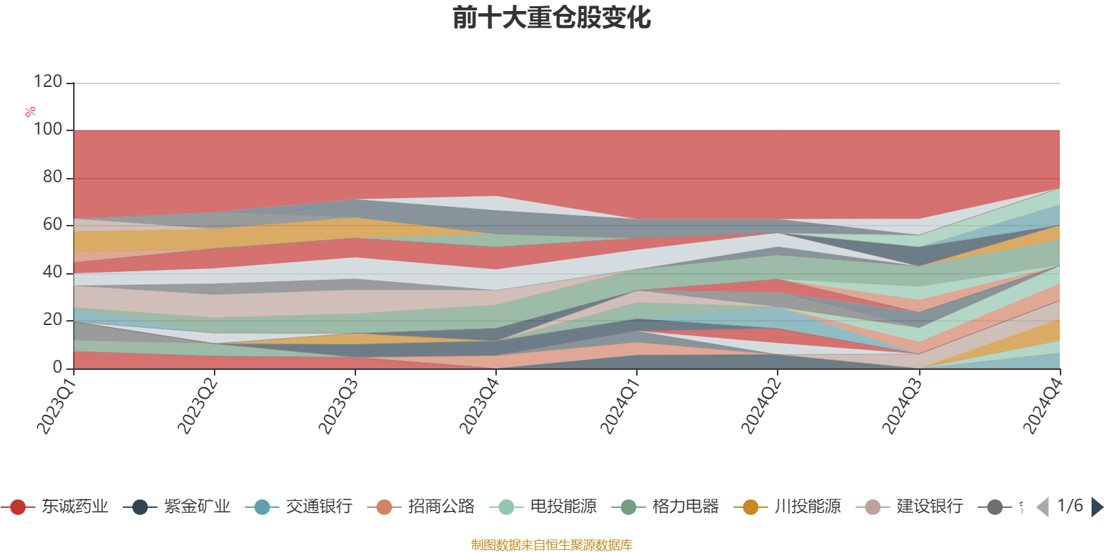 该基金持股集中度较高,近2年前十大重仓股集中度长期超过60%。截至2024年末,基金十大重仓股分别是长江电力、川投能源、国投电力、建设银行、工商银行、农业银行、中国银行、交通银行、云铝股份、电投能源。